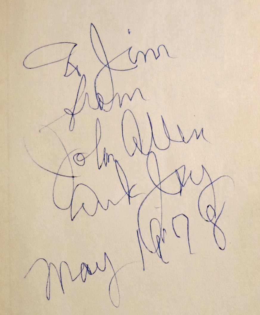 When I got close to doing my internship, he gave me a hardback copy of The World Bible, a collection of excerpts from many sacred texts. It was signed “To Jim from John Allen and Joy, May 1978.” Joy was his wonderful wife. She took great pleasure in telling me step by step cooking instructions. It was a struggle to listen politely, but she was a sweet lady. I gradually learned that Joy and John were at polar opposites in some areas of philosophy and religion, but their relationship worked.