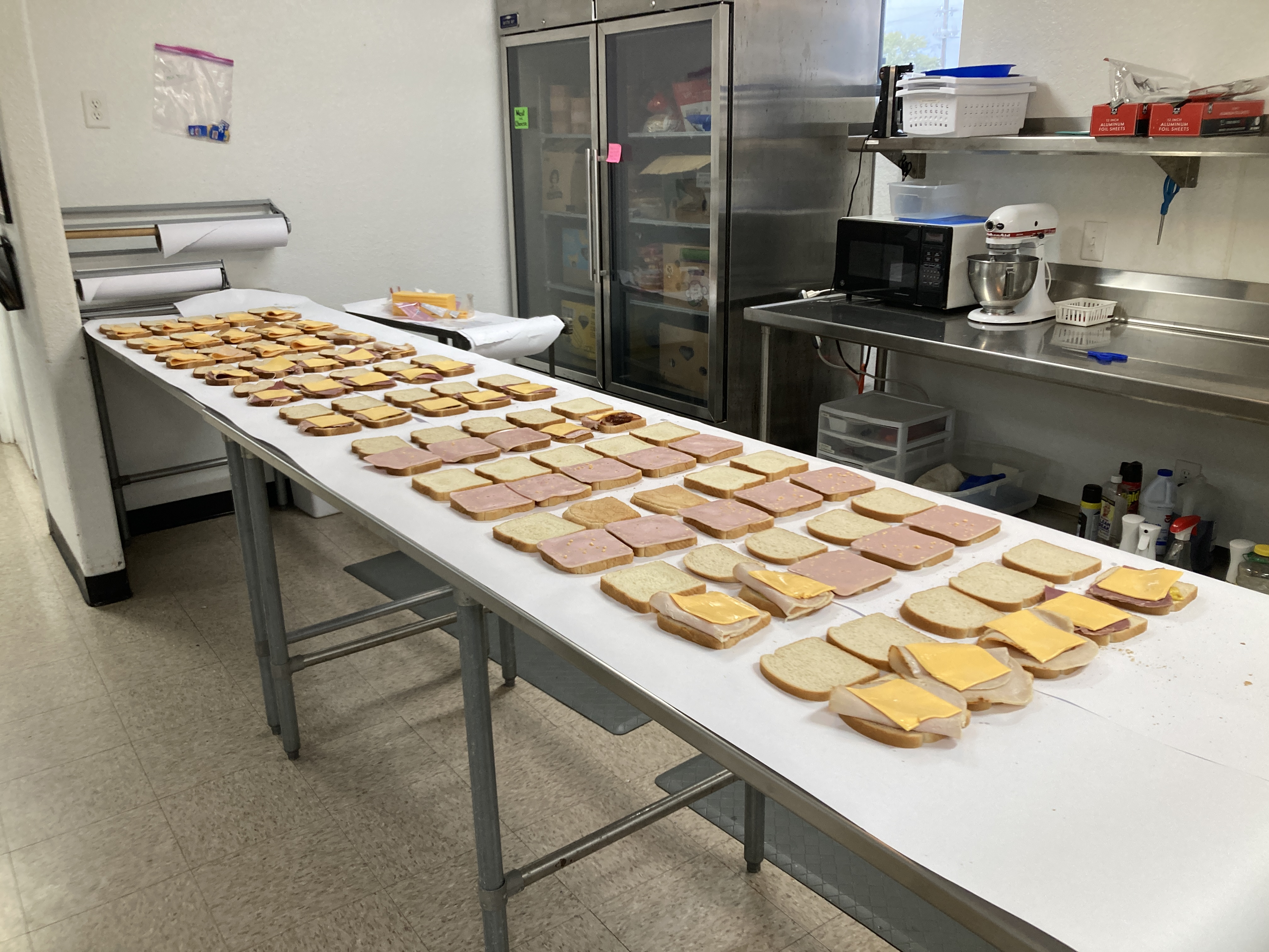 Volunteers at Sack Lunch make about fifty sandwiches at a time by spreading bread over a long make-table. Need a hundred sandwiches? Do two rotations. Pretty simple.